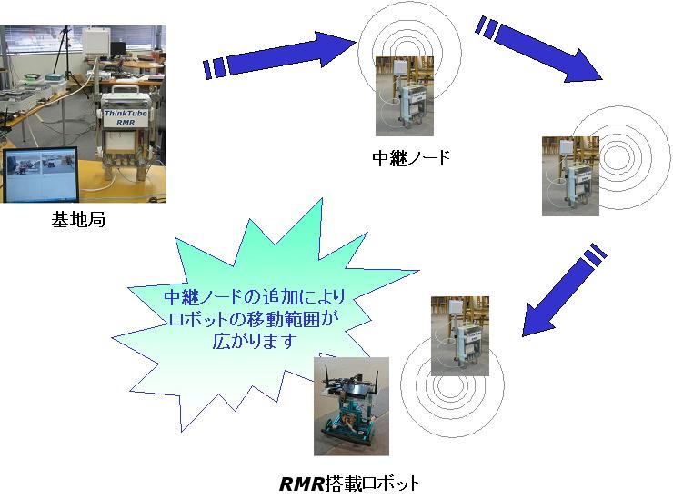 バッテリー稼動のRMRノードを周辺に設置し、中継ノードを追加していくことで、ロボットの移動範囲をどんどん