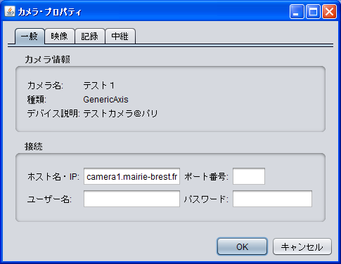 Device: Generic Axis (IP Address, port, user, pwd) Acapulco@メキシコ 200.67.209.172, 60000 Paris/パリ camera1.mairie-brest.fr 六甲アイランド(TT社内に限る) 192.168.3.161, , tt, tt Device: Generic Panasonic (IP Address, port, user, pwd) 日本のどこか 61.192.219.172 六甲アイランド(TT社内に限る) 192.168.3.162